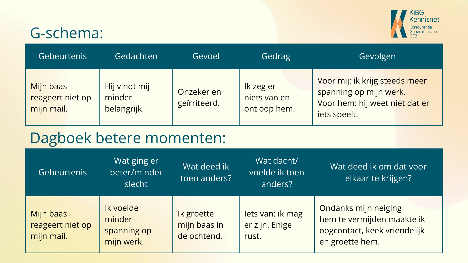 “We kennen allemaal het G-schema wel. Het ‘Dagboek van betere momenten’ lijkt er op, maar de insteek is positief gericht. Hieronder zie je een dagboek dat ik met een cliënt heb ingevuld.”